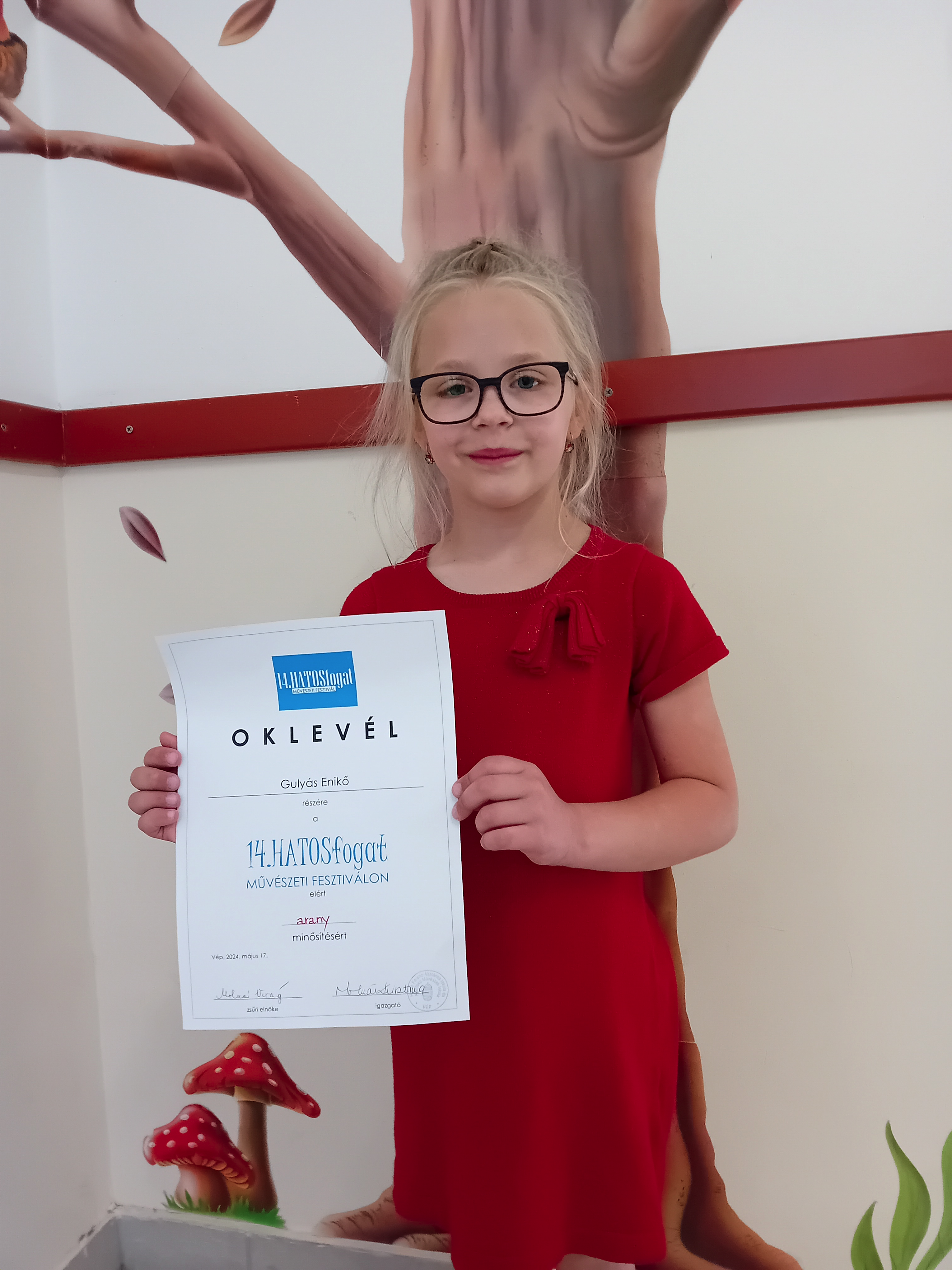 A Hatosfogat Művészeti Fesztiválon Gulyás Enikő, 1. a osztályos tanuló vers és prózamondó kategóriában arany minősítést szerzett. Felkészítő tanára: Kiss Istvánné. Gratulálunk!