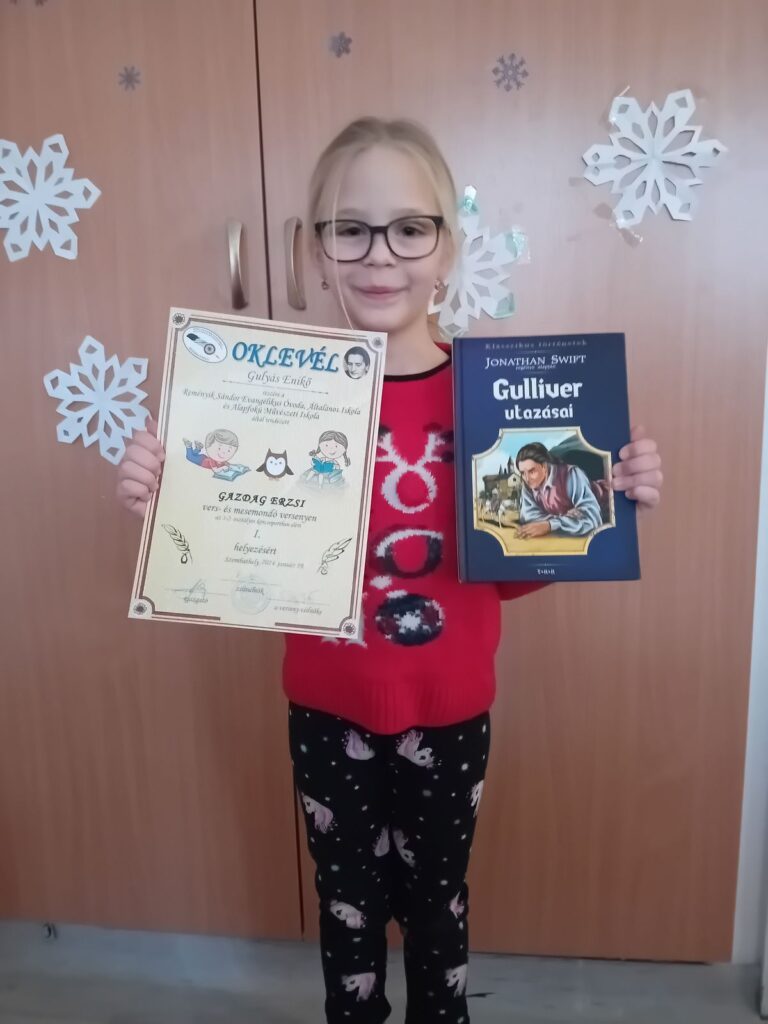 Iskolánk két tanulója vett részt a szombathelyi Gazdag Erzsi vers- és mesemondó versenyen a szombathelyi Reményik Sándor Evangélikus Általános és Művészeti Iskolában. Gulyás Enikő (1. A) saját kategóriájában 1. helyezést ért el, felkészítő tanára: Kiss Istvánné. Györe- Szabó Jázmin 3. helyezett lett, felkészítő tanára: Dobos- Fuisz Andrea.Gratulálunk mindenkinek!