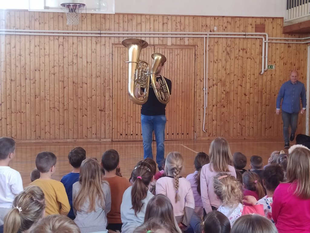 Április 30-án iskolánkban az óvodások egy része és iskolánk első két évfolyama vett rész a zeneiskola tanárai által tartott hangszerbemutatón. Tóth Máté és Szentgyörgyvári Tibor ismertette a gyerekekkel a fafúvós és rézfúvós hangszerek egy csoportját. Megszólaltattak klarinétot, tenorkürtöt és tubát is, majd ismert gyerekdalokat játszottak el hangszereiken, amit az óvodások és a kisiskolások lelkesen énekeltek.